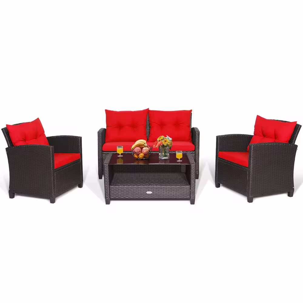 Costway 4 -Piece Patio Rattan Furniture Set Glass Table Shelf Sofa Cushion Red