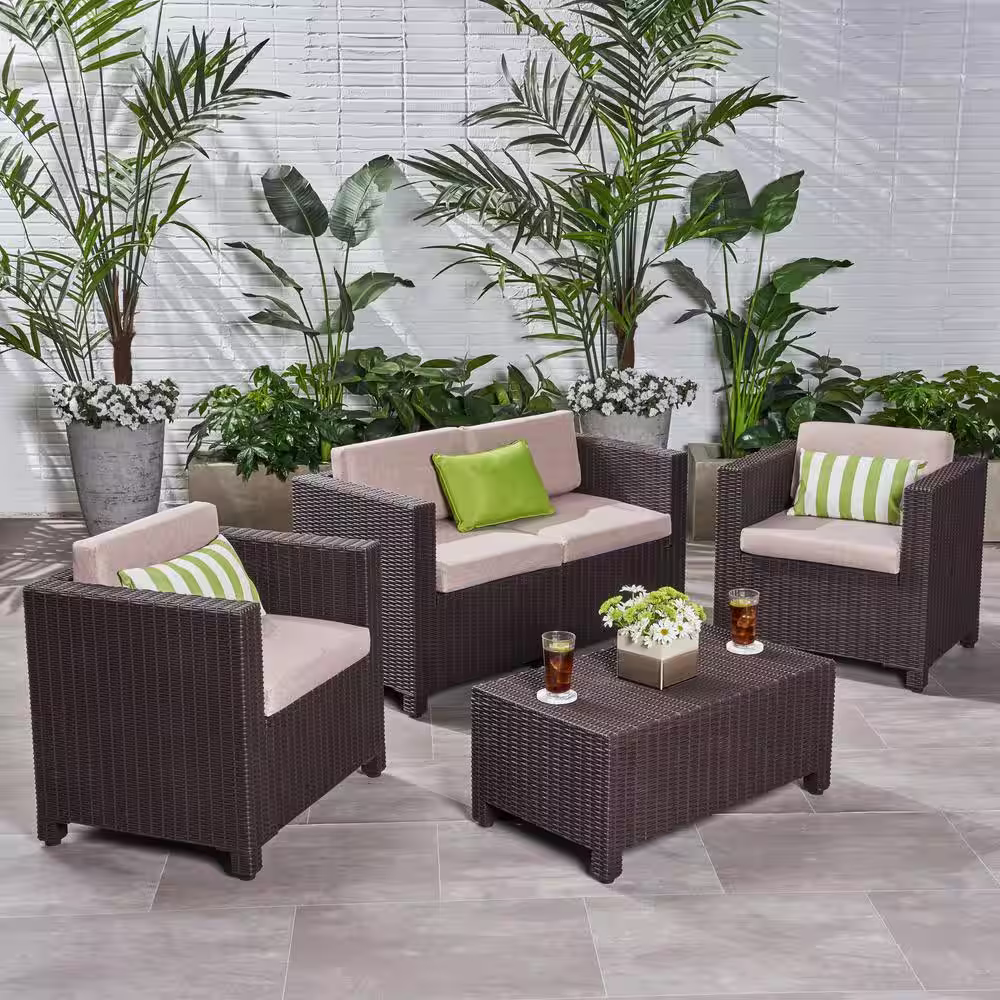 Noble House Primrose Dark Brown 4-Piece All Weather Faux Rattan Patio Conversation Set with Beige Cushions