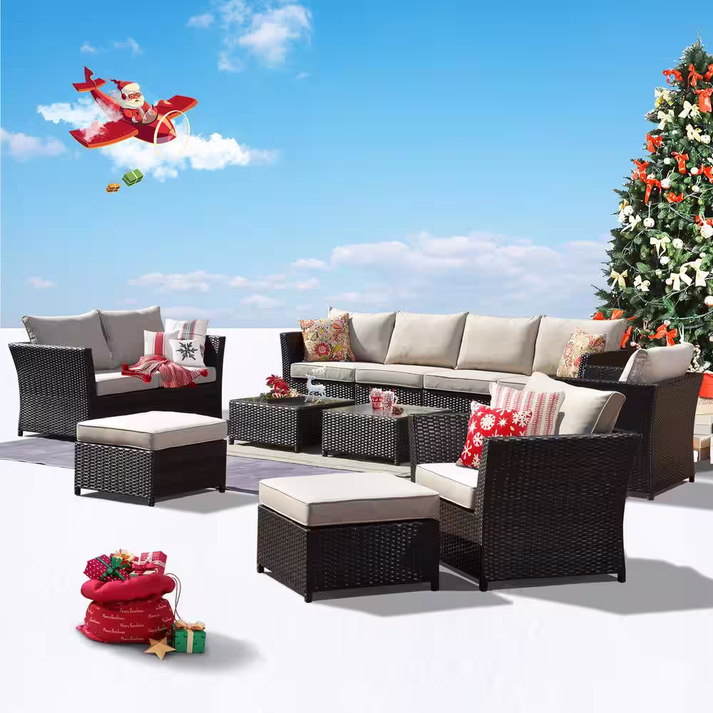HOOOWOOO Mesa Brown 12-Piece No Assembly Wicker Outdoor Patio Conversation Sofa Set with Beige Cushions