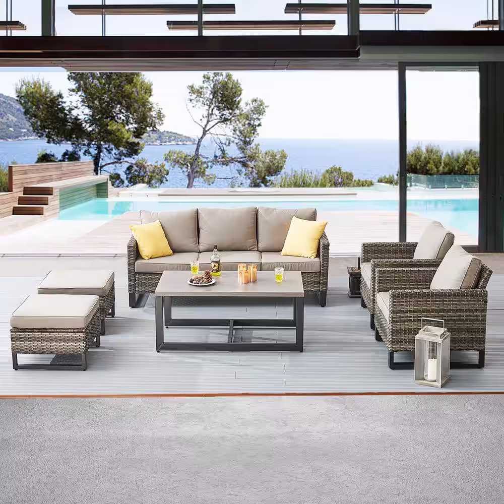 Pocassy 6-Piece All Weater Wicker Outdoor Patio Conversation Sectional Sofa Set with Tea Table, Gray Cushions and Ottomans Set