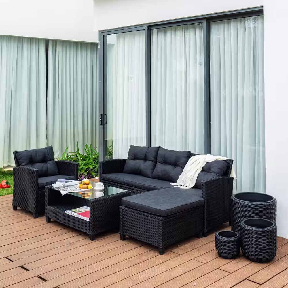 MADE 4 HOME Versailles Black 4-Piece Wicker Patio Conversation Sectional Seating Set with Black Cushions and Ottoman