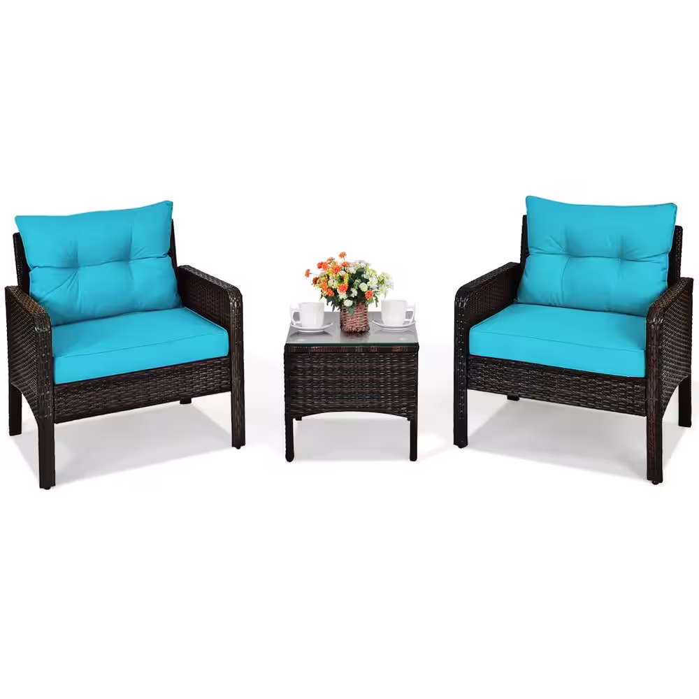 Costway 28 in. Brown Frame 3-Piece Plastic Rattan Patio Conversation Seating Set with Turquoise Cushions