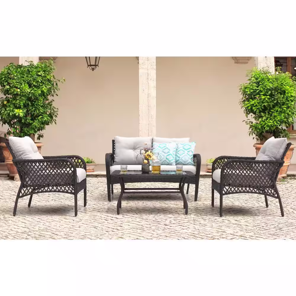 Nuu Garden 4-Piece Rattan Wicker Patio Conversation Set Outdoor Sofa Set in Brown with Beige Cushions