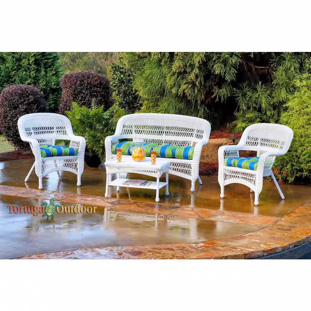 Tortuga Outdoor Portside 4pc White Wicker Patio Furniture Seating Set with Haliwell Cushions (Wicker Chairs, Loveseat, and Coffee Table)