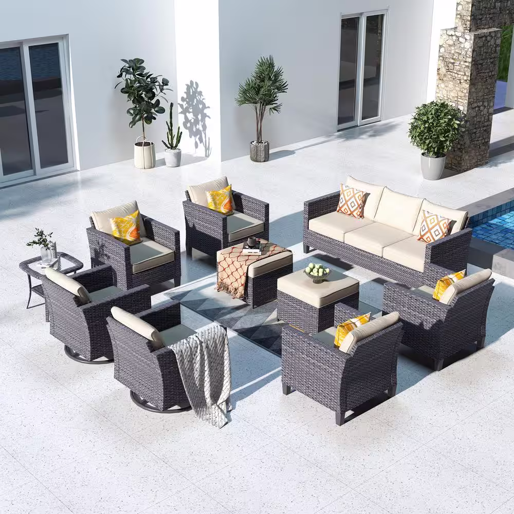 XIZZI Megon Holly Gray 10-Piece Wicker Patio Conversation Seating Sofa Set with Beige Cushions and Swivel Rocking Chairs