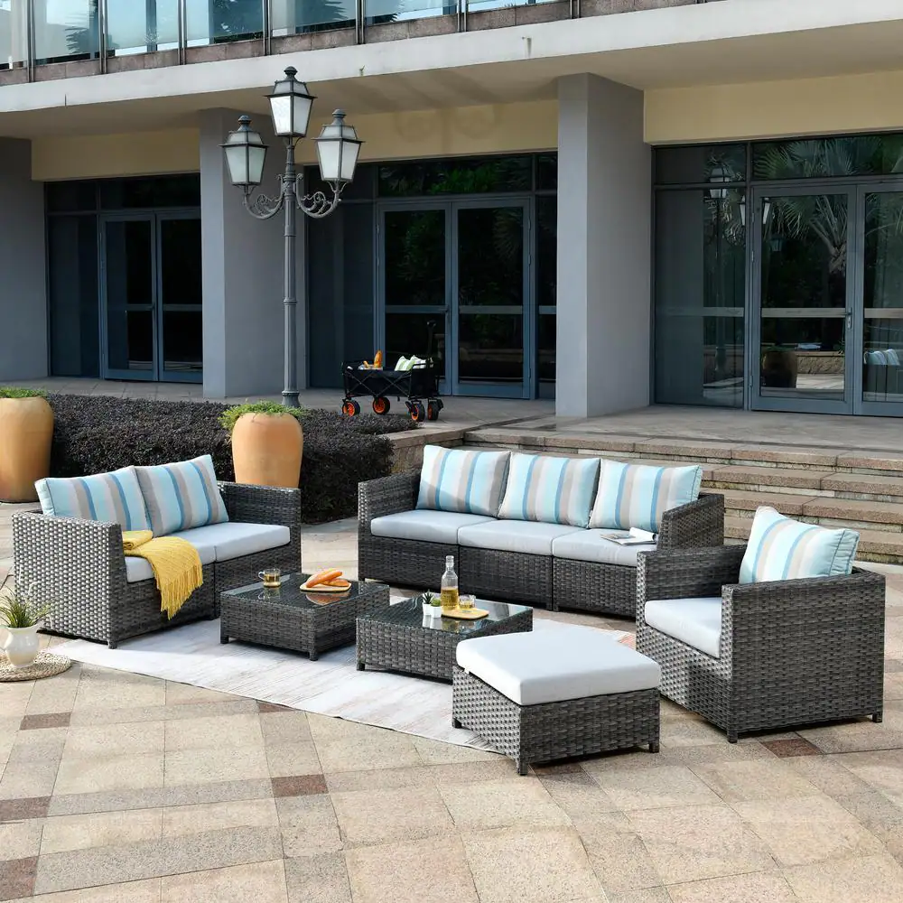 HOOOWOOO Lake Caddo Gray 9-Piece No Assembly Wicker Patio Conversation Sofa Set with Two Coffee Tables and Sunbrella Cushions