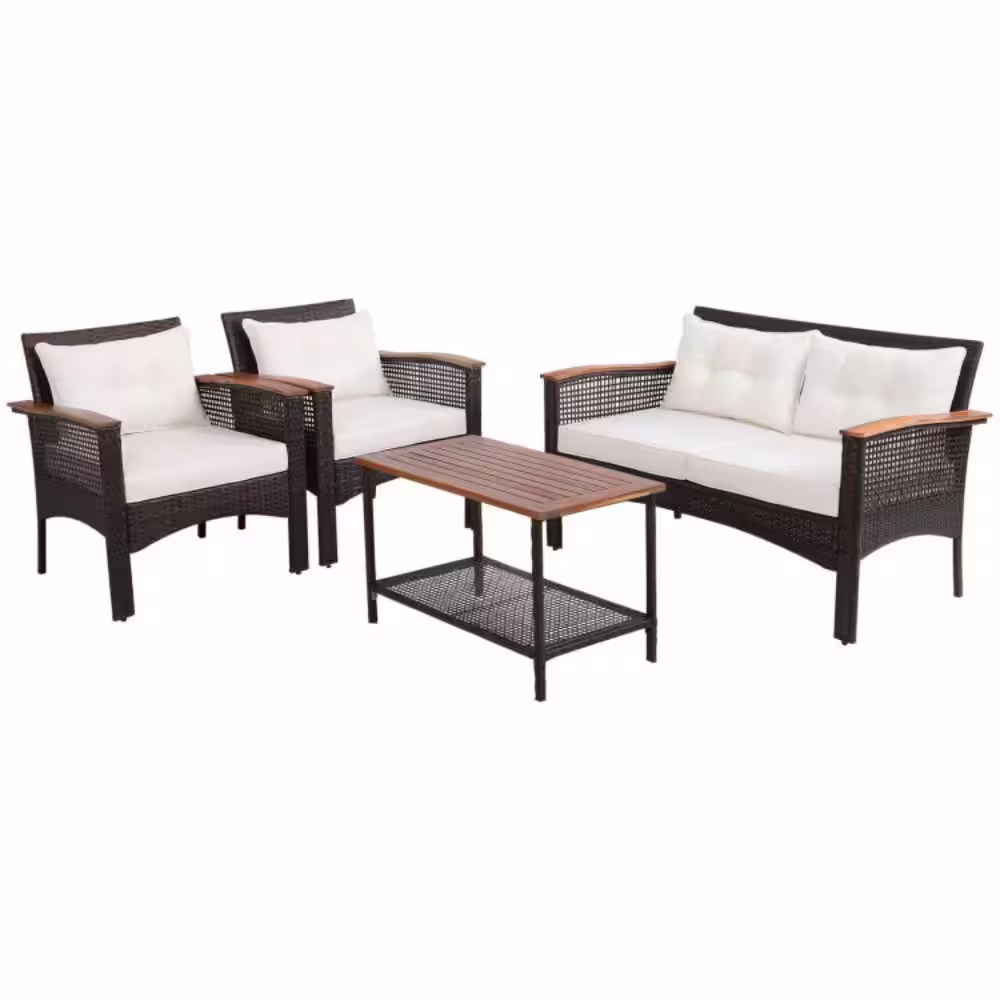 Alpulon 4-Pieces Patio Rattan Acacia Wood Patio Conversation Set with White Cushions