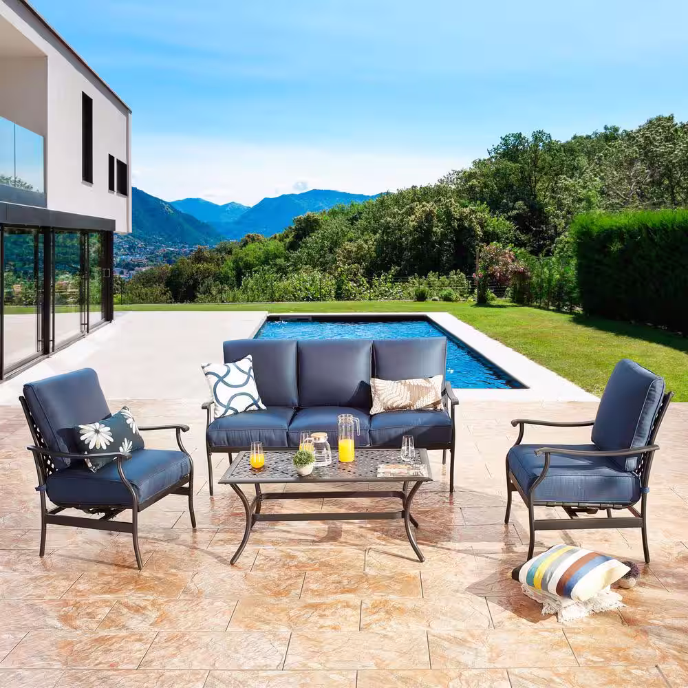 Patio Festival 4-Piece Metal Patio Conversation Set with Blue Cushions