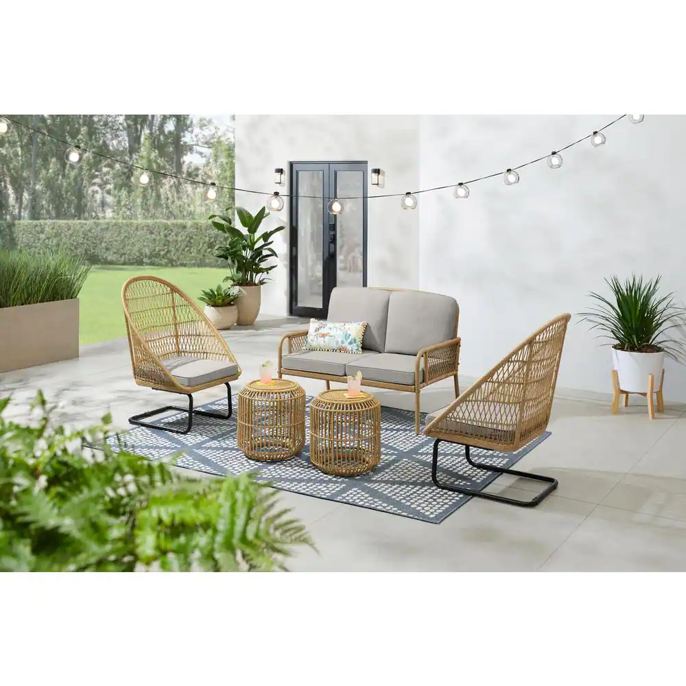 Hampton Bay Sierra Creek Tan 5-Piece Wicker Outdoor Patio Conversation Deep Seating Set with CushionGuard Stone Gray Cushions