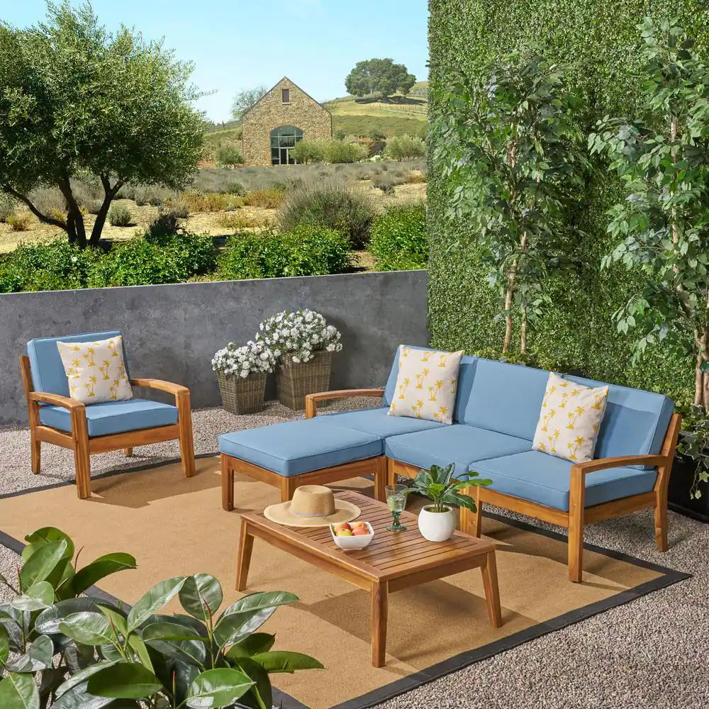 Noble House Grenada Teak Brown 6-Piece Wood Patio Conversation Sectional Seating Set with Blue Cushions