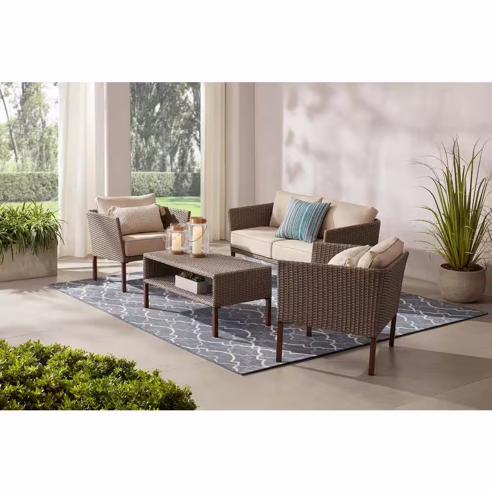 StyleWell Oakshire 4-Piece Wicker Outdoor Deep Seating Set with Tan Cushions