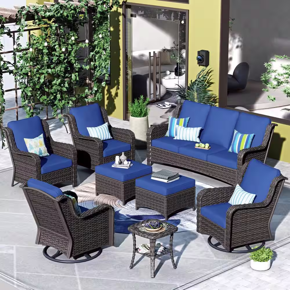 HOOOWOOO Oreille Brown 8-Piece Wicker Outdoor Patio Conversation Sofa Set with Swivel Rocking Chairs and Navy Blue Cushions