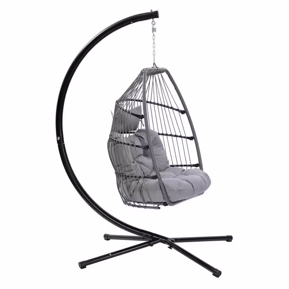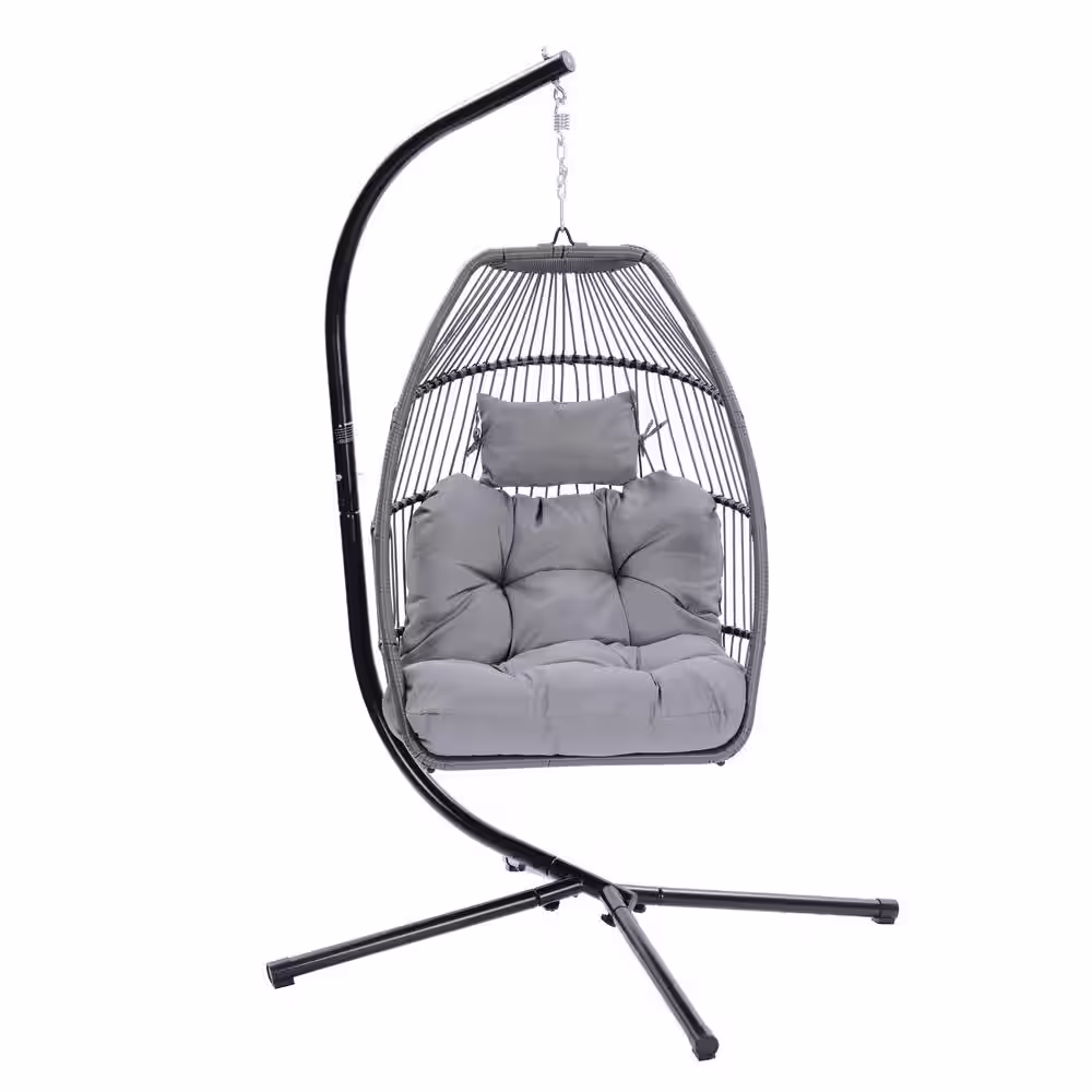 HONEY JOY 6.75 ft. Free Standing Modern Rattan Hanging Egg Swing Chair with Stand Foldable Cushioned Hammock in Gray