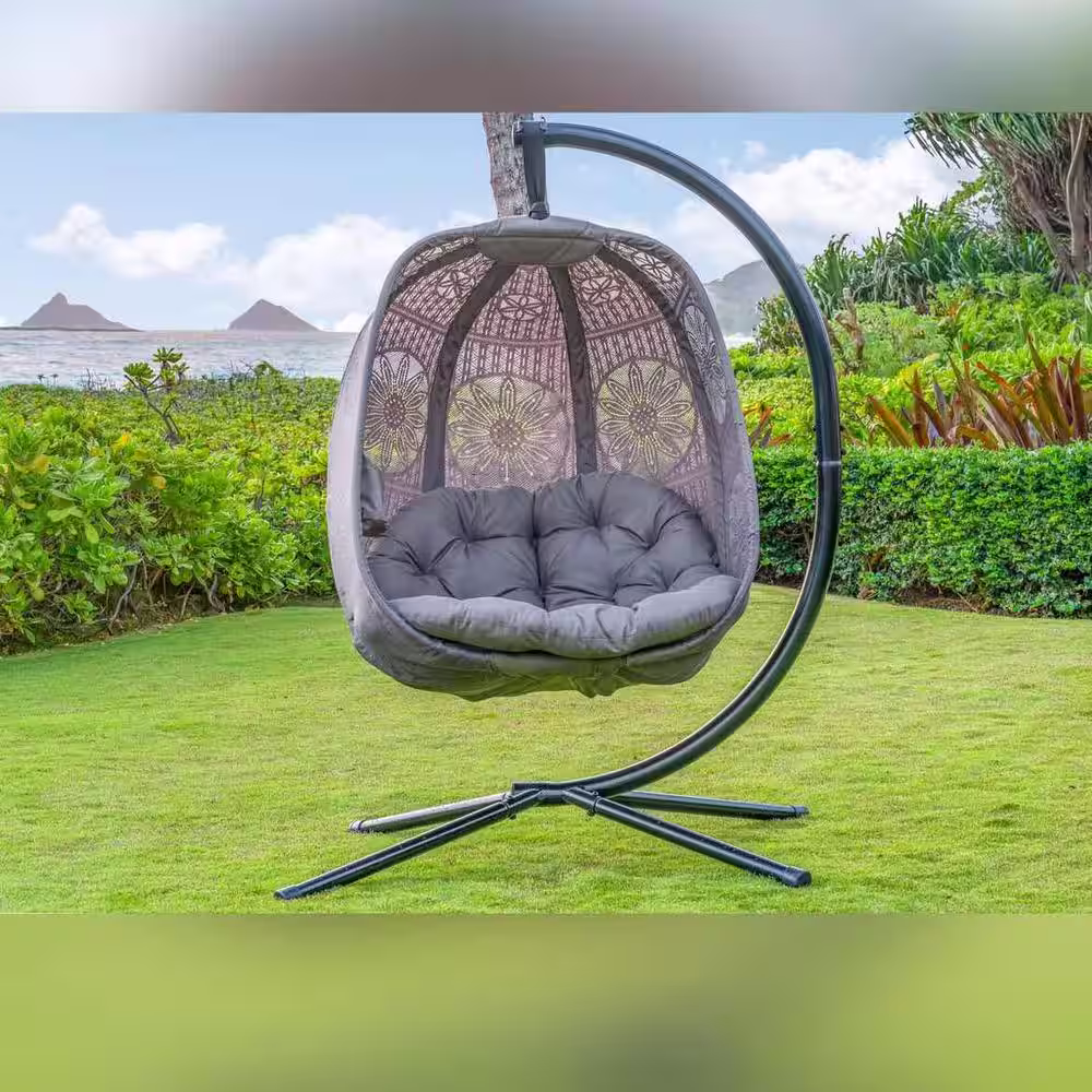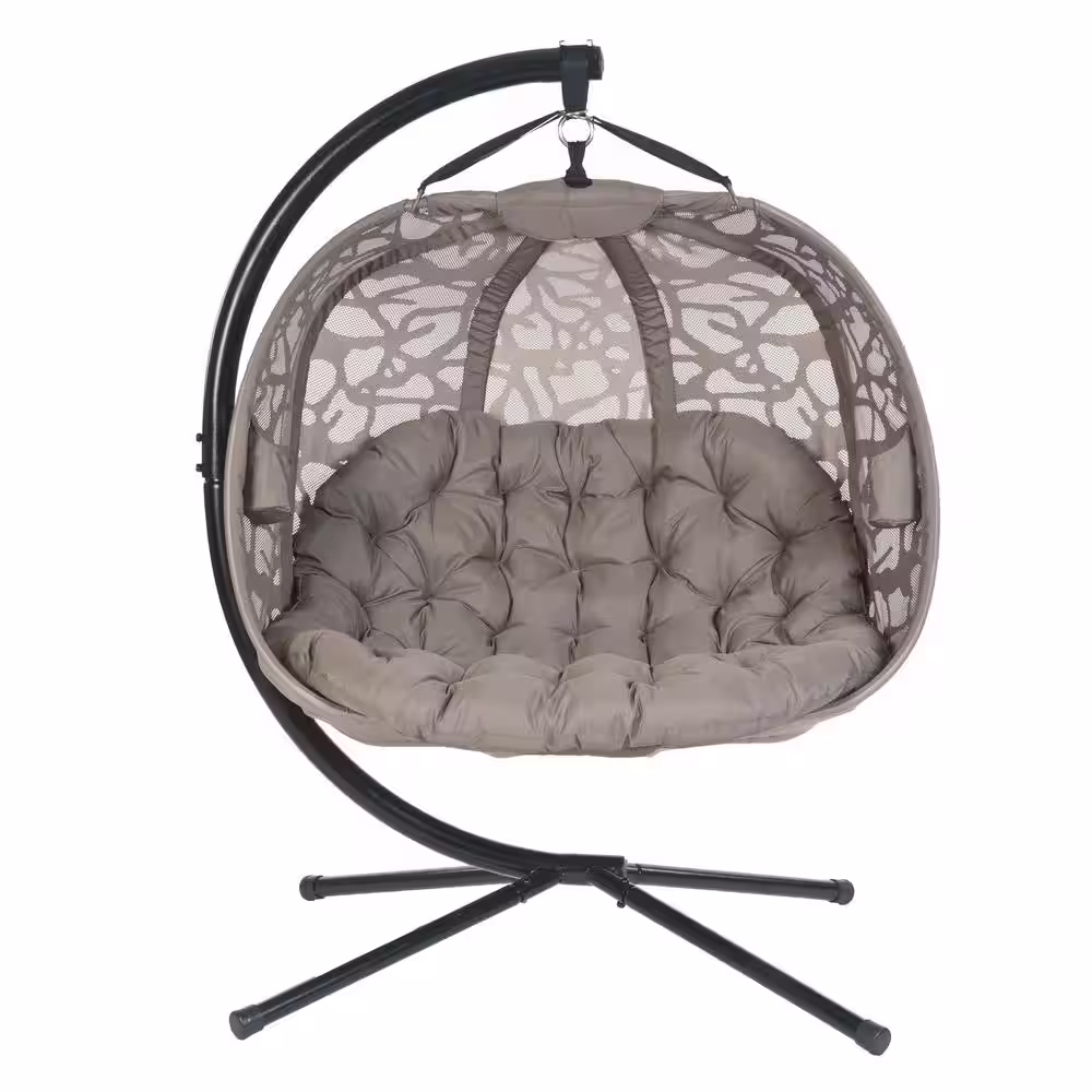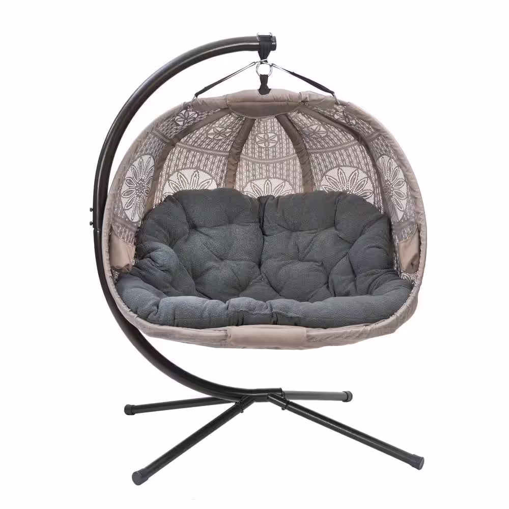 None 66 in. H x 50 in. W x 43 in. D Beige Hanging Pumpkin Loveseat Chair Hammock with Gray Cushion, and Branch Design