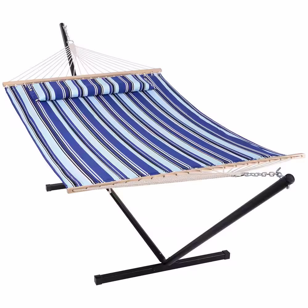 Atesun 12 ft. Free Standing, 475 lbs. Capacity, Heavy-Duty 2-Person Hammock with Stand and Detachable Pillow in Blue Stripes