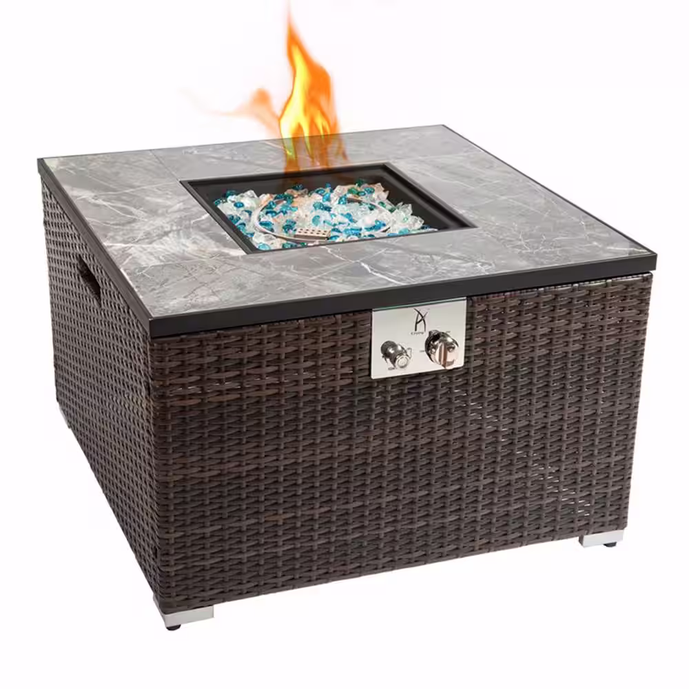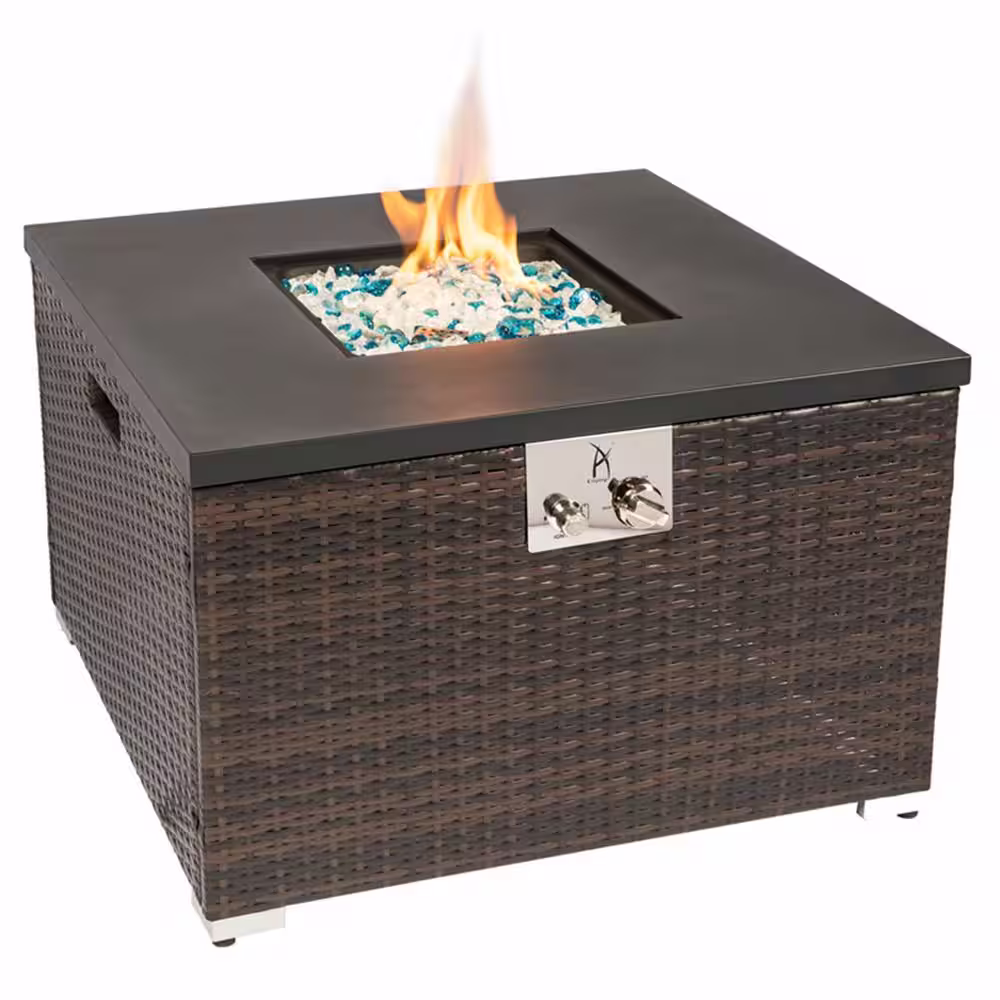 waelph Outdoor Gas Fire Pit Square Dark Brown Wicker Fire Pit Table Propane Fire Table with Glass Rocks