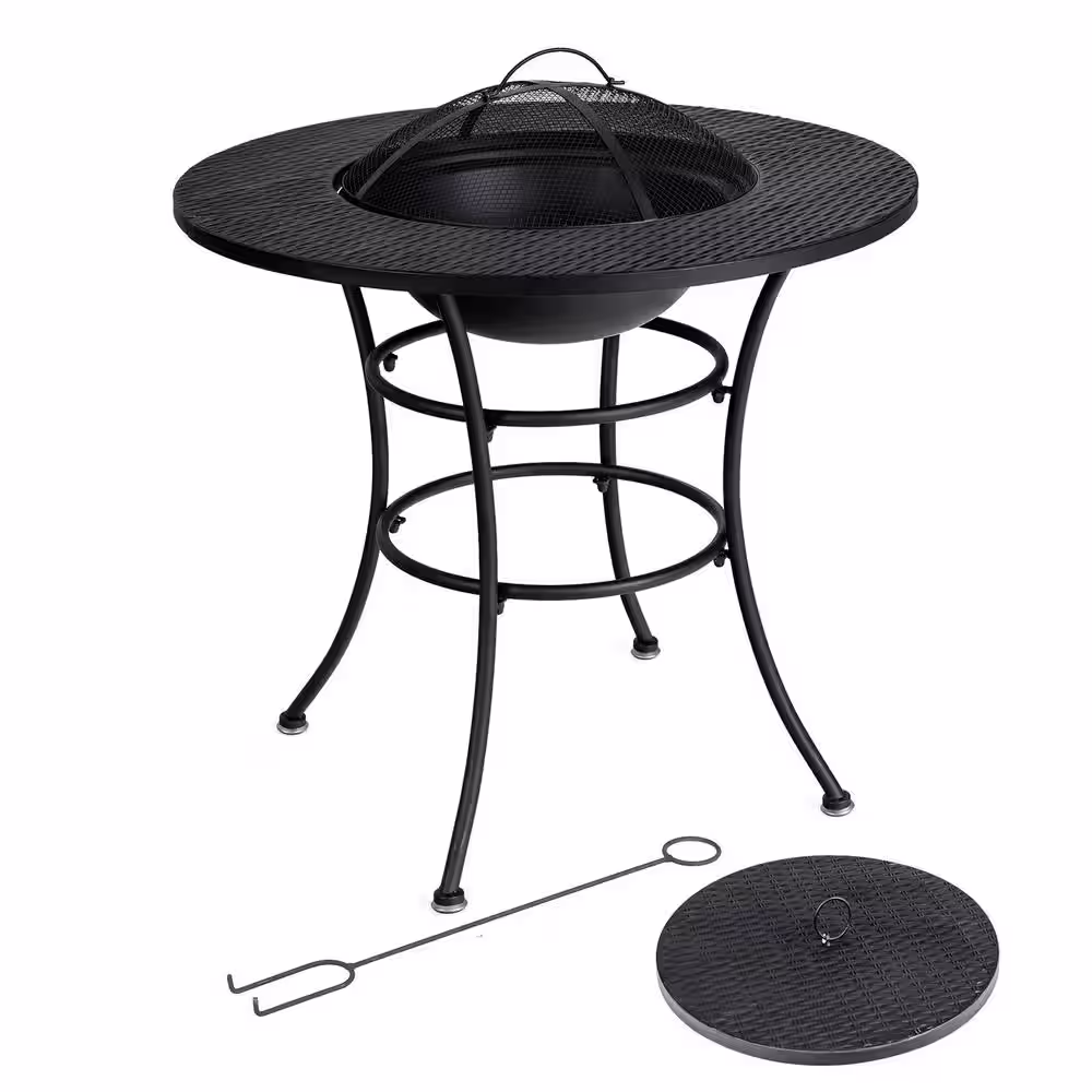 Gymax Black Patio Round Metal Fire Pit Dining Table Charcoal Wood Burning Cooking BBQ Grate