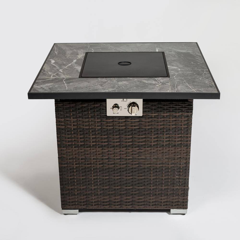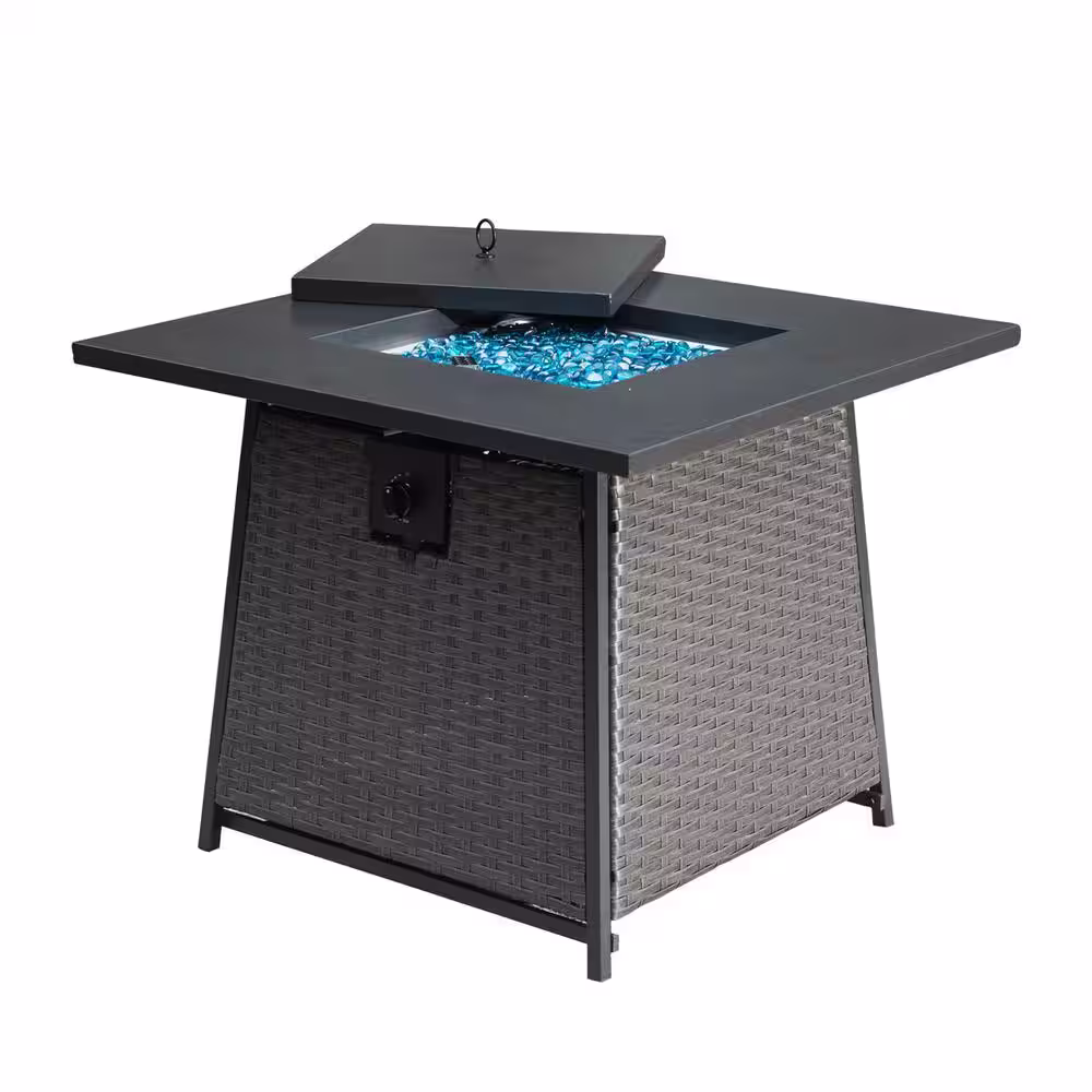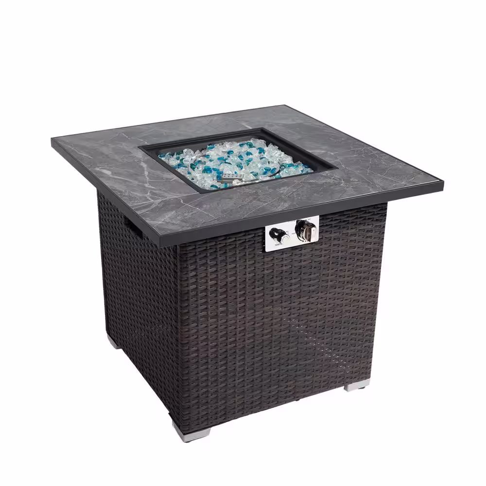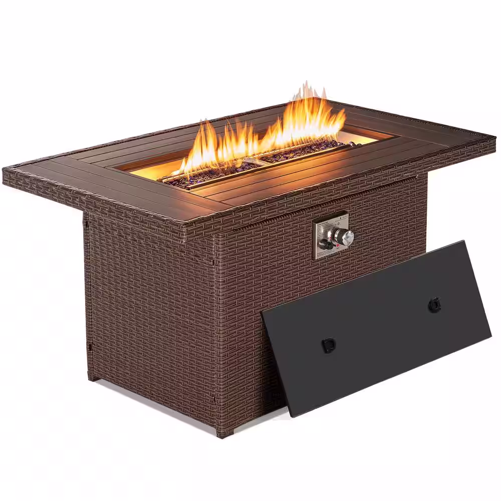 None Brown Rectangular Wicker Outdoor Fire Pit Table with Glass Rocks, 40000 BTU