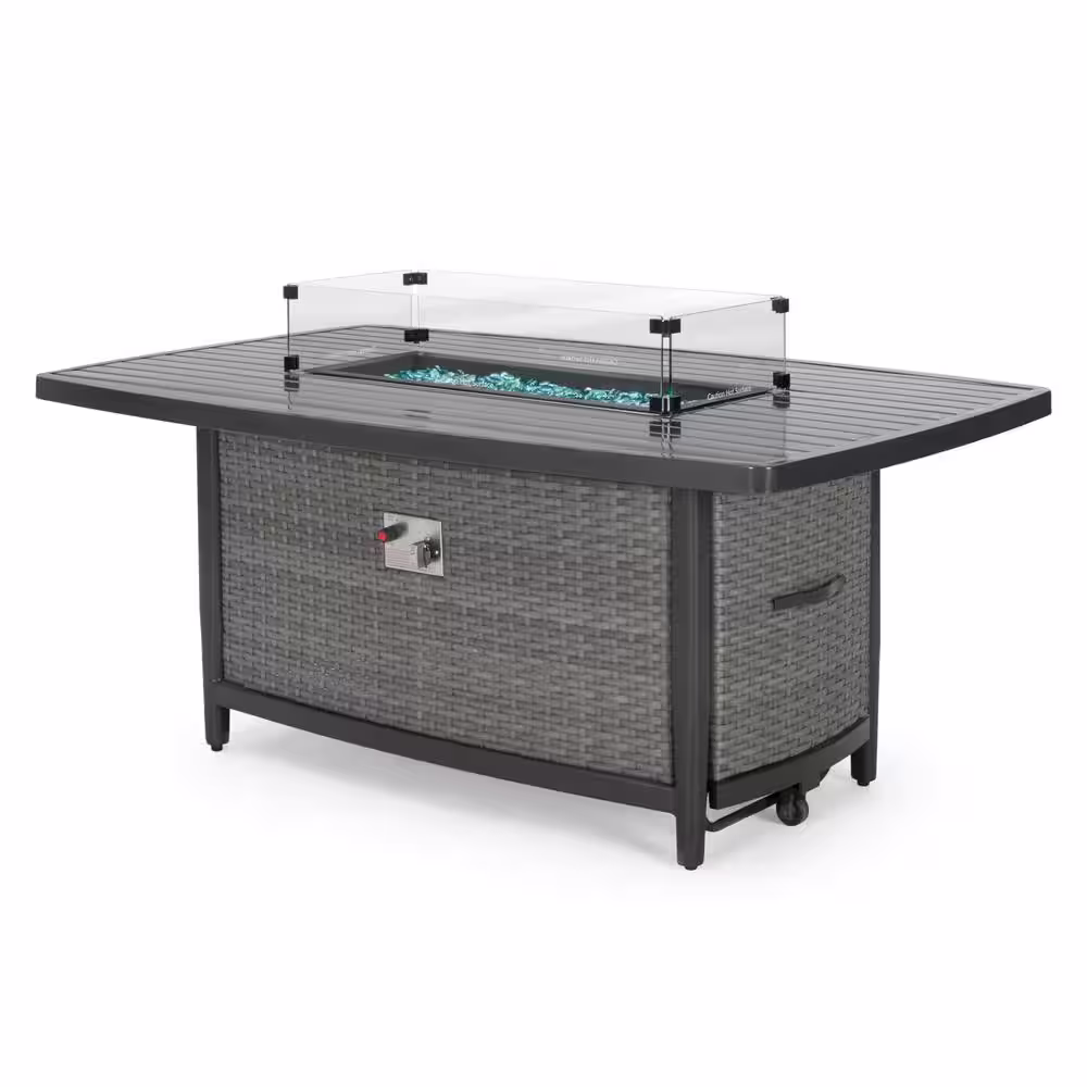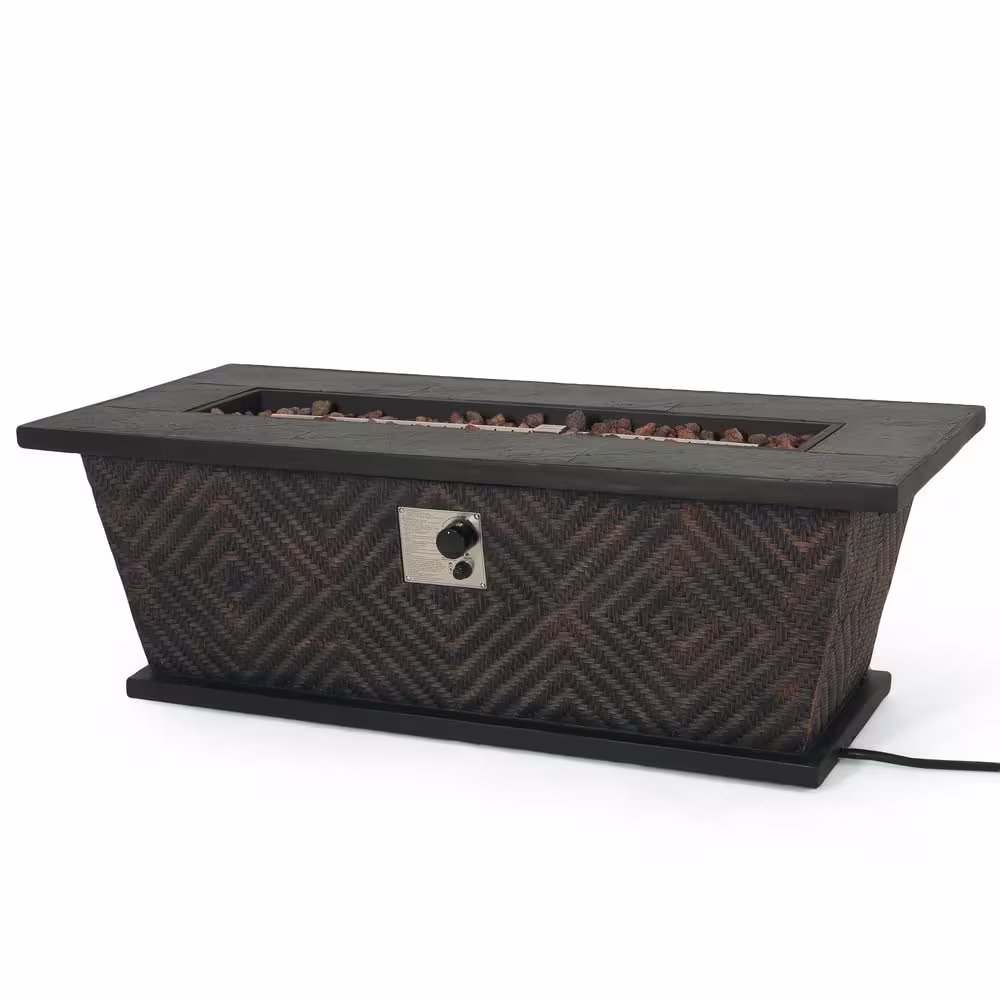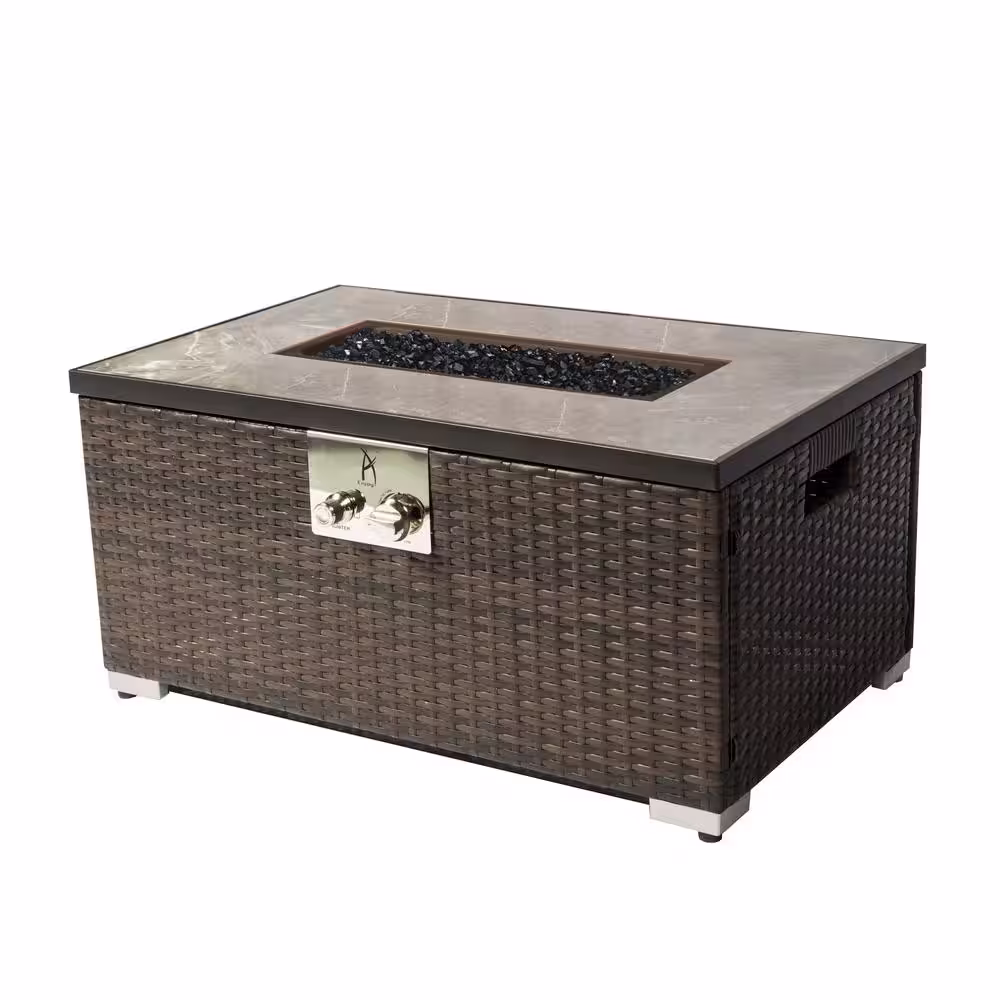 None Brown Rectangular Wicker Outdoor Fire Pit Table with Glass Rocks, 50000 BTU