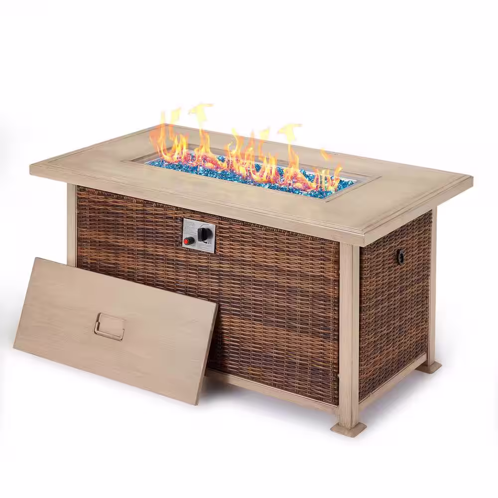 None Brown 50 in. Rectangular Wicker Propane Outdoor Fire Pit Table for Garden Patio Lawn