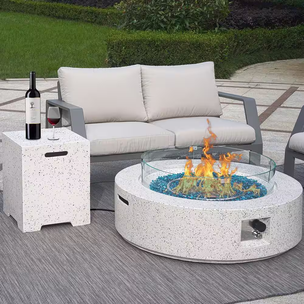 None 41 in. 50000 BTU Elegant White Round Composite GRFC Fire Pit Table with Glass Wind Guard and Water-Resistent Cover