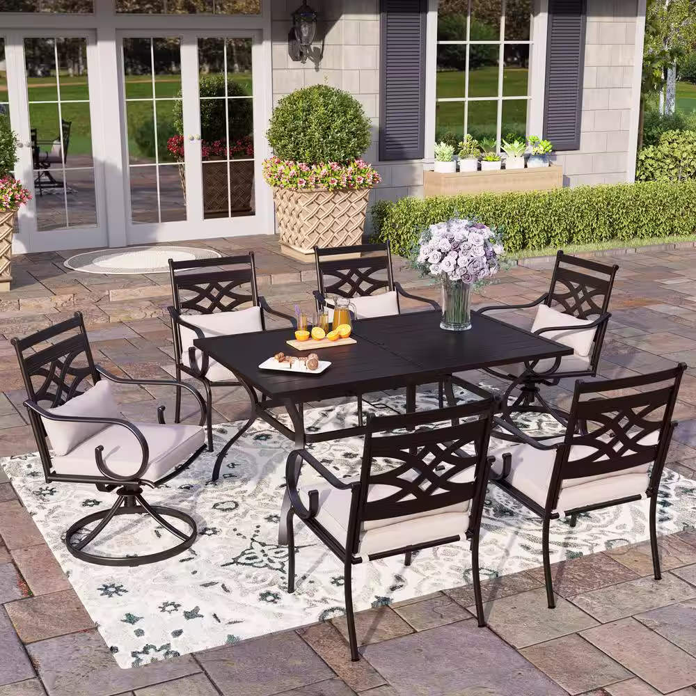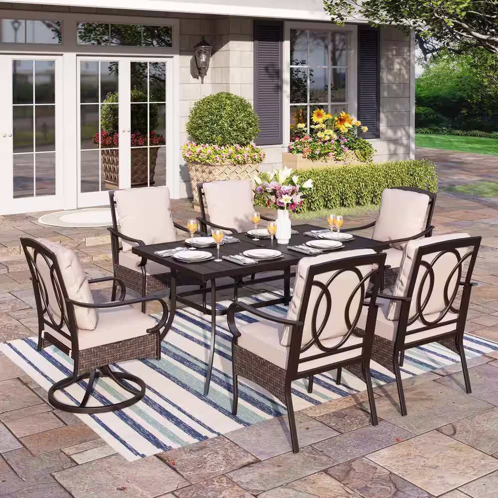 None 7-Piece Black Metal Outdoor Dining Set with Rectangle Dining Slat Table and Swivel Chairs with Beige Cushions