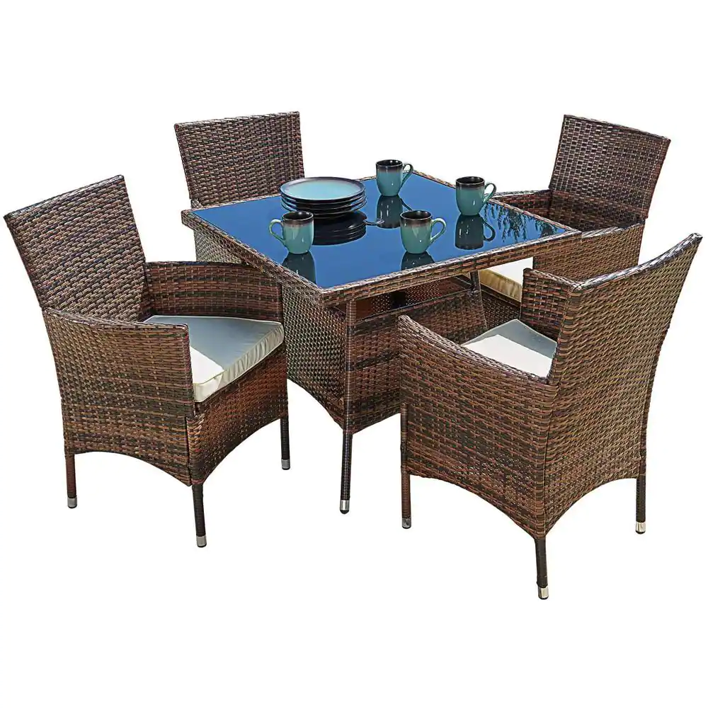 None Brown 5-Piece Wicker Square Outdoor Dining Set with Brown Cushions