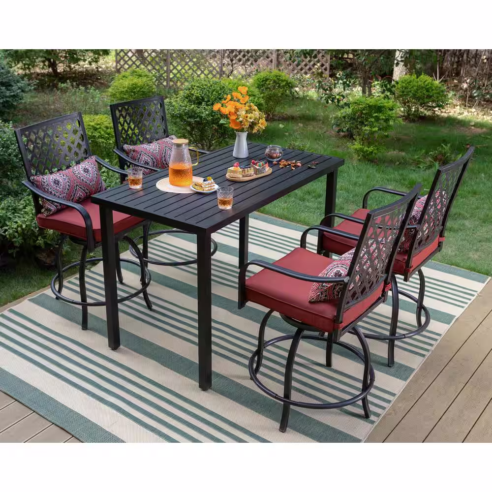 None 5-Piece Metal Outdoor Bar Height Dining Set with Red Cushions