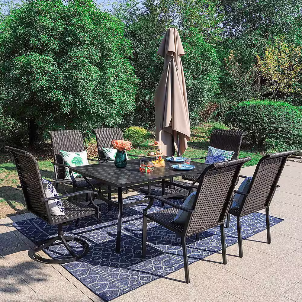 None Black 7-Piece Patio Outdoor Dining Set with Rectangle Slat Table and Rattan Swivel Chair