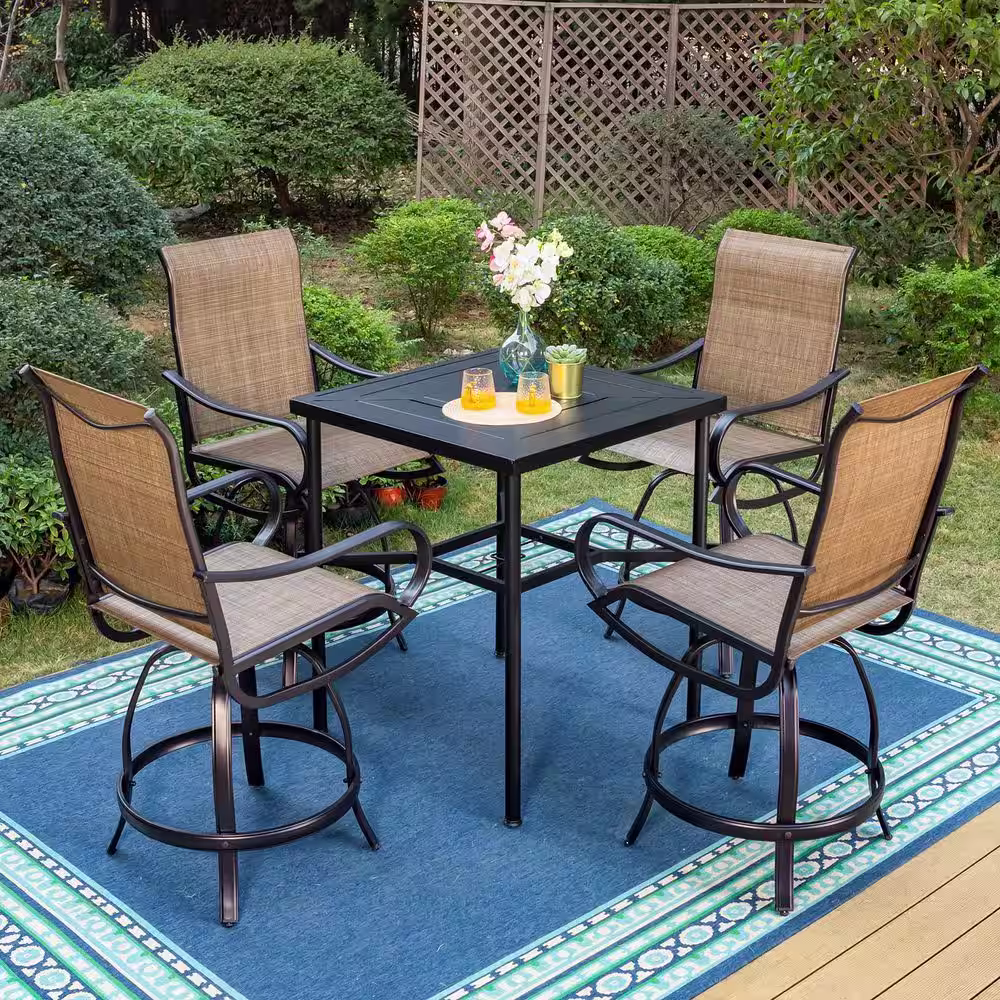 None 5-Piece Metal Outdoor Bar Height Dining Set with Straight-Leg Square Table and Textilene Swivel Bar Stools