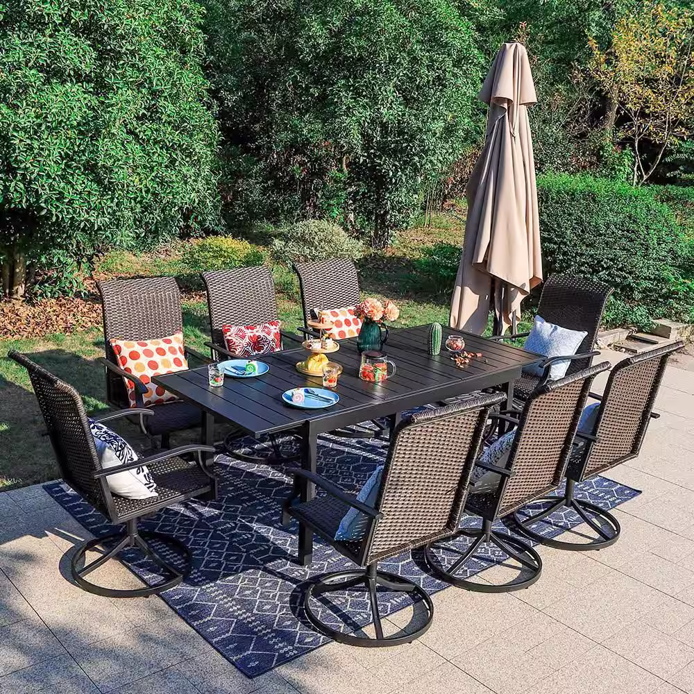 None 9-Piece Metal Rectangle Patio Outdoor Dining Set with Extensible Table and Swivel Chair