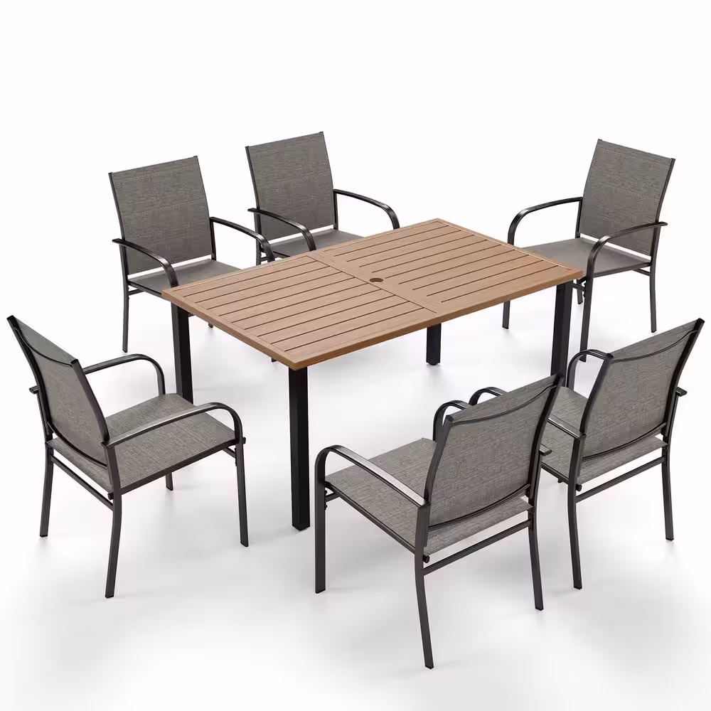 None Black 7-Piece Metal Outdoor Patio Dining Set with Wood Finish Rectangle Table and Brown Textilene Chairs