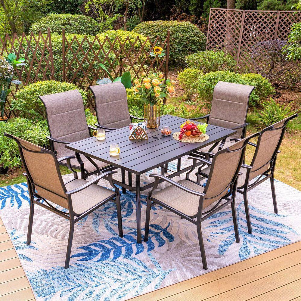 None Black 7-Piece Metal Slat Rectangle Table Outdoor Patio Dining Set with High Back Padded Textilene Chairs