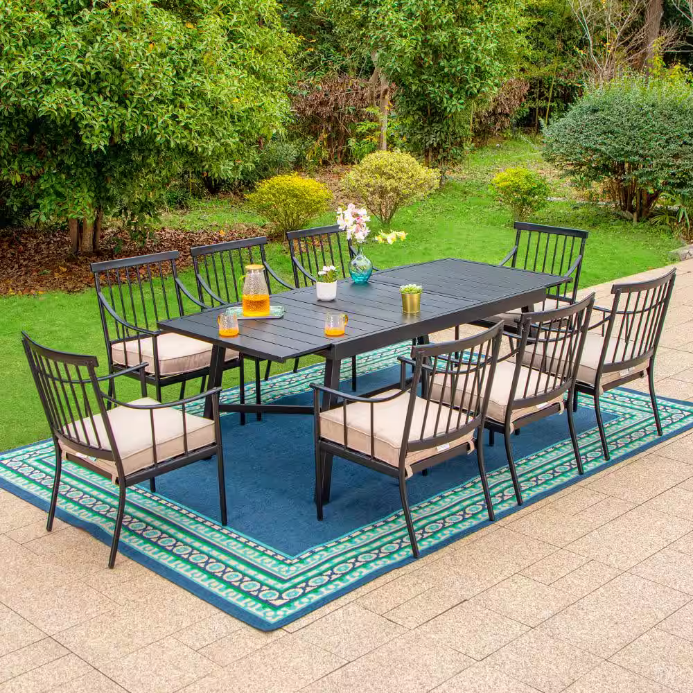 None 9-Piece Metal Outdoor Dining Set with Extensible Rectangular Slat Table and Stylish Chairs with Beige Cushions