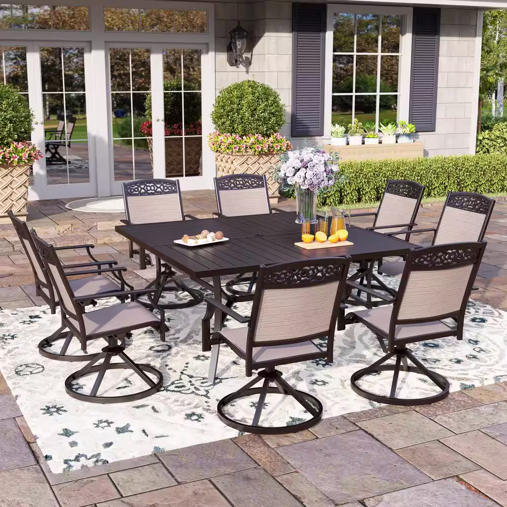 None 9-Piece Metal Outdoor Dining Set with Square Table and Textilene Aluminum Swivel Dining