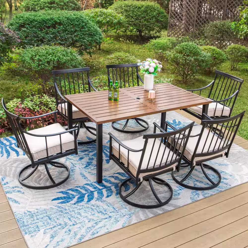 None 7-Piece Metal Patio Outdoor Dining Set with Brown Slat Table-Top and Swivel Stylish Chairs with Beige Cushion