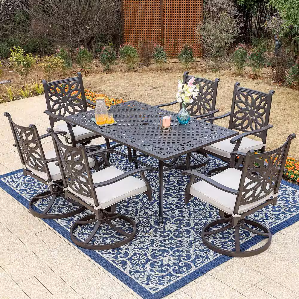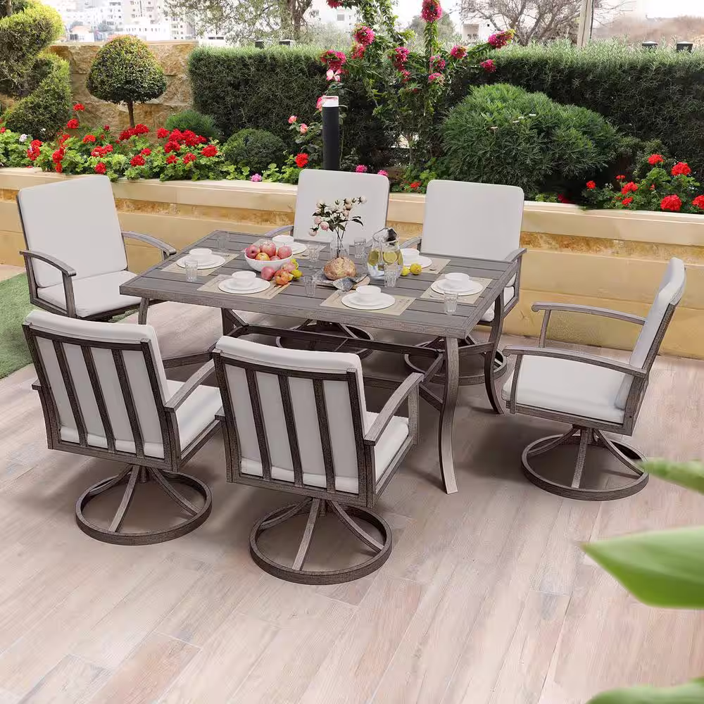 None Brown 7-Piece Cast Aluminum Patio Outdoor Dining Set with Rectangle Table and Swivel Chairs with Beige Cushion