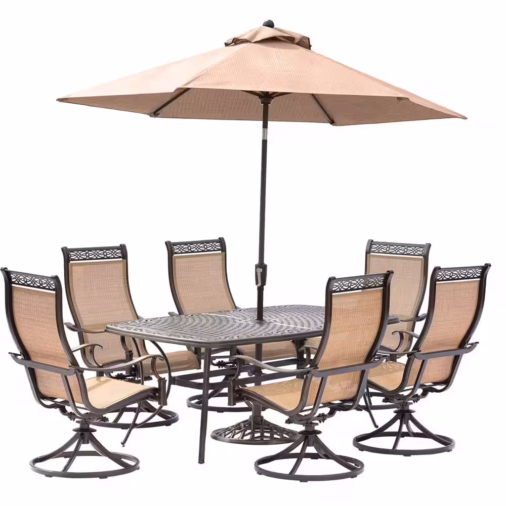 Hanover Manor 7-Piece Aluminum Rectangular Outdoor Dining Set with Swivels, Cast-Top Table, Umbrella and Base