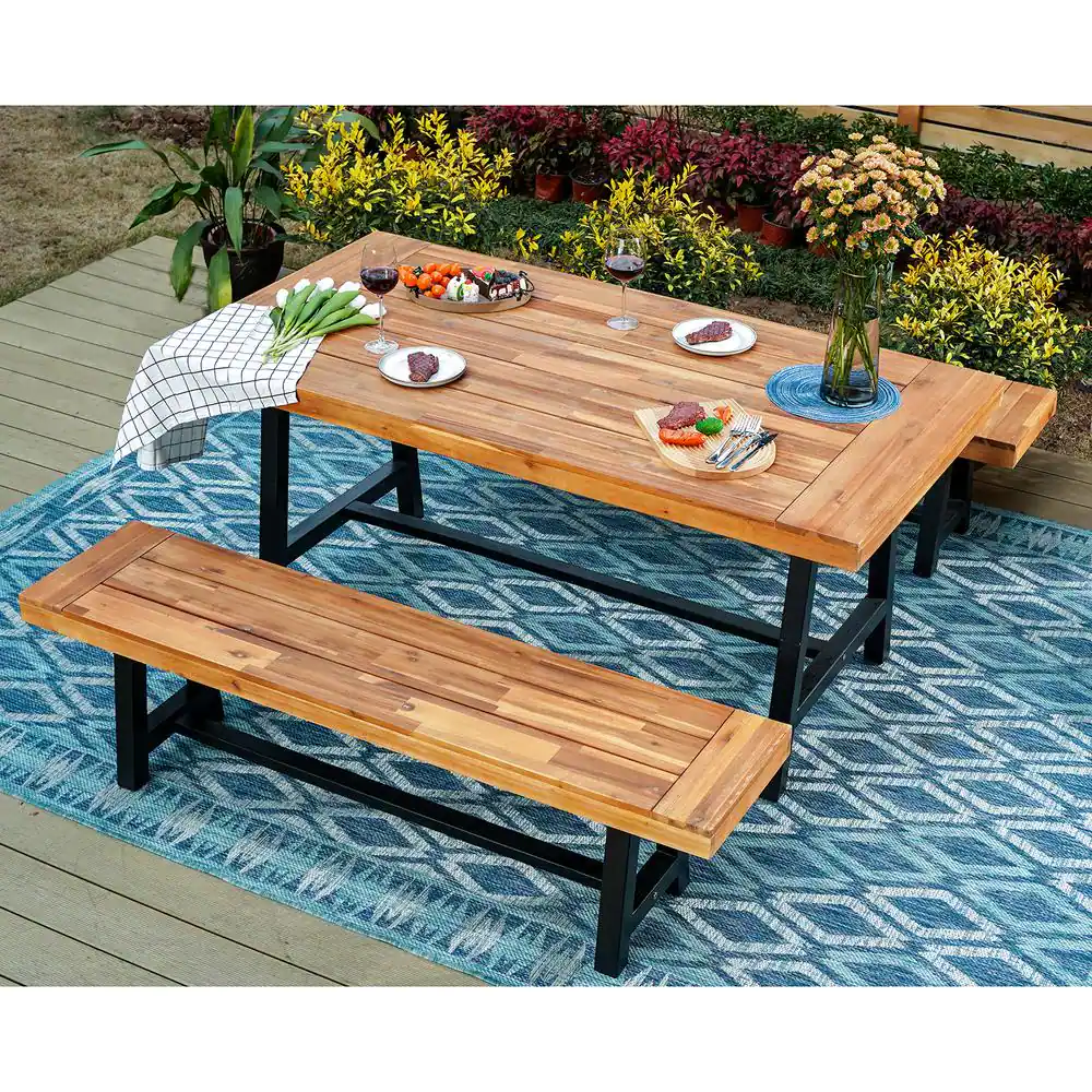 None Black 3-Piece Patio Acacia Wood with Rectangular Table Outdoor Dining Set and Long Benches