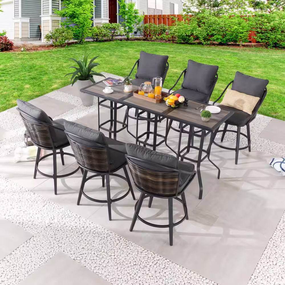 None 7-Piece Black Metal Outdoor Dining Set with Rectangle Dining Slat Table and Swivel Chairs with Beige Cushions