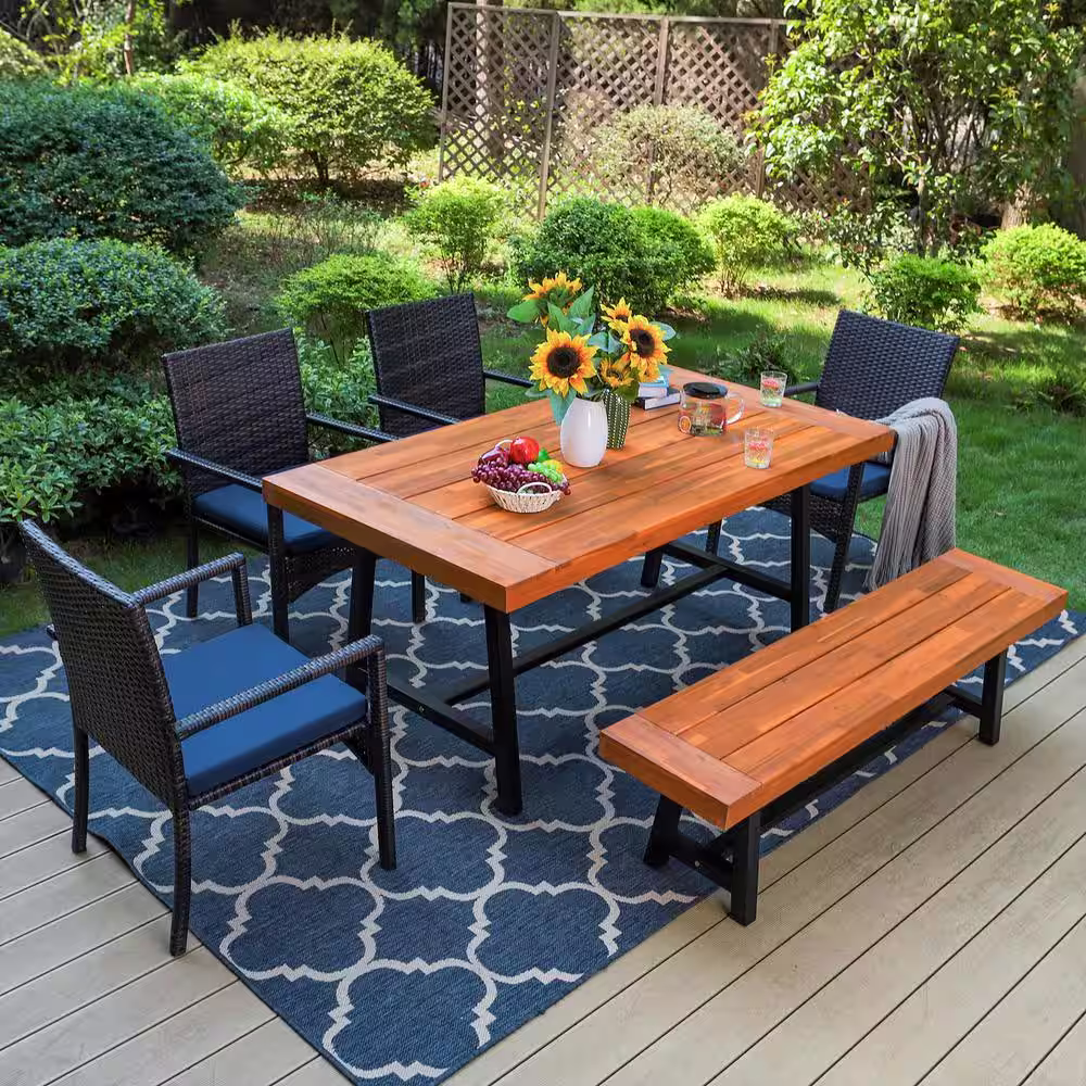 None Black 6-Piece Metal Patio Acacia Wood Outdoor Dining Set with Rectangular Table, 4 Rattan Chairs and Long Bench