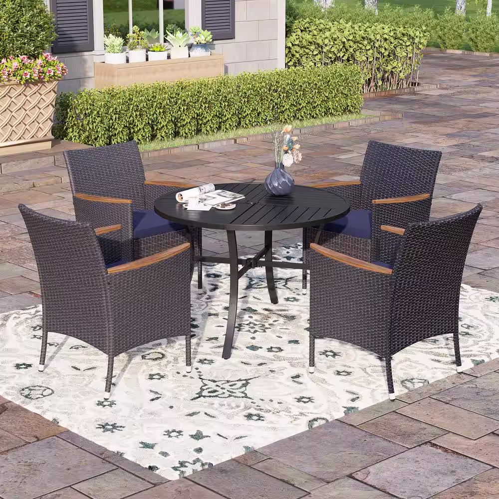 None Black 5-Piece Metal Patio Outdoor Dining Sets with Round Table and Wooden Armrest Rattan Chairs with Blue Cushion