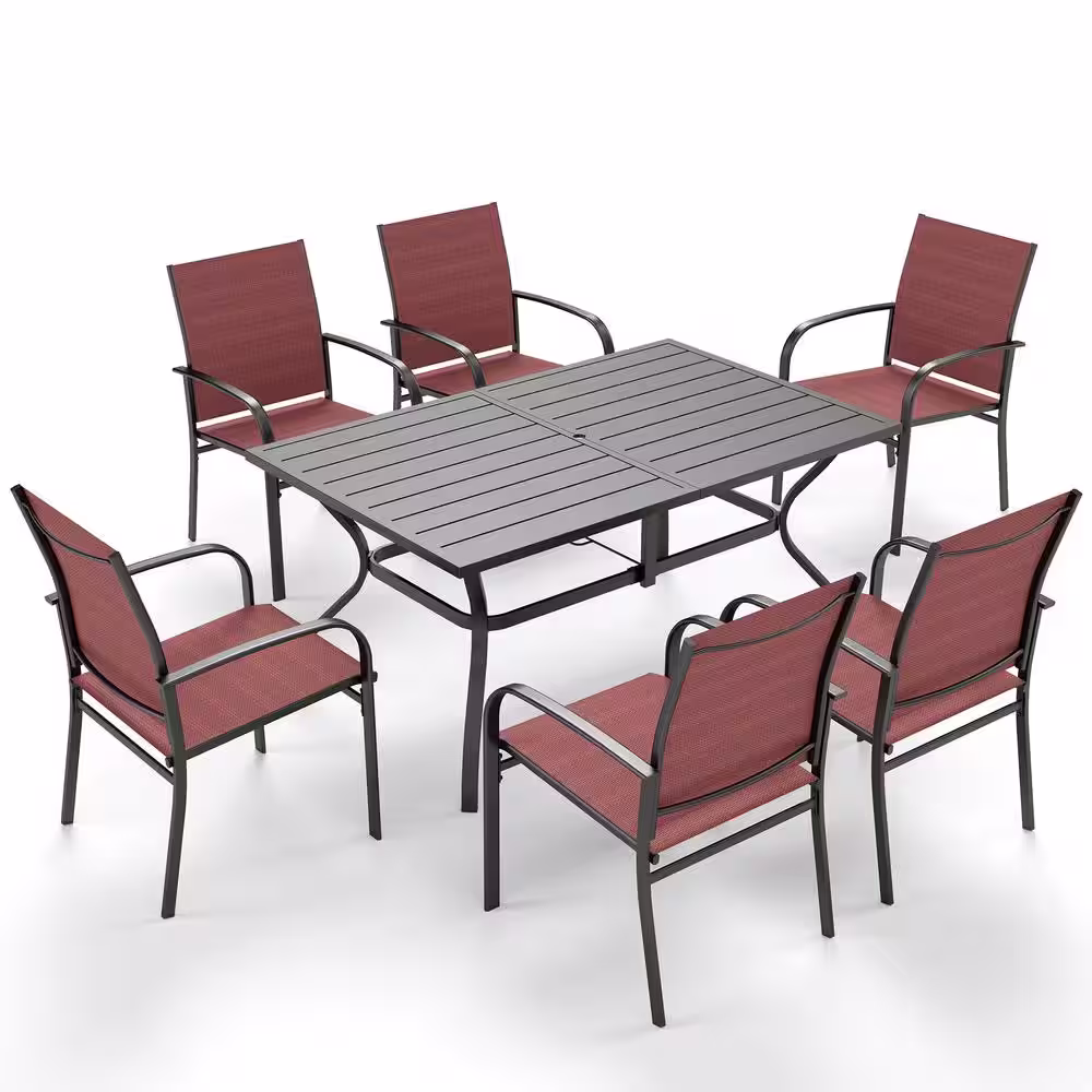 None Black 7-Piece Metal Slat Rectangle Table Outdoor Patio Dining Set with Red Textilene Chairs