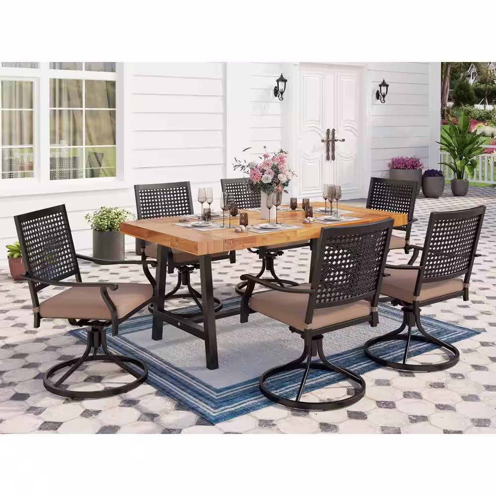 None 7-Piece Metal Patio Outdoor Dining Set with Wood Dining Table and Bull's Eye Pattern Swivel Chairs with Beige Cushions