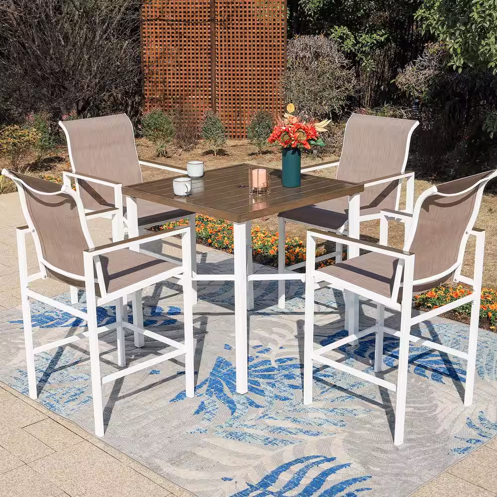 None White 5-Piece Metal Outdoor Bar Height Dining Set With Straight-Leg Square Table and Textilene Bar Stools