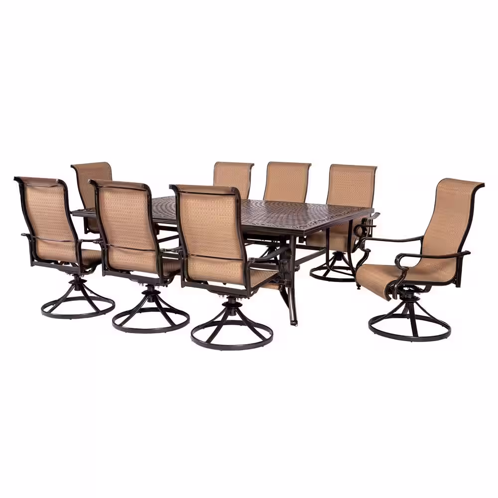 Hanover Brigantine 9-Piece Aluminum Outdoor Dining Set with an XL Cast-Top Table and 8-Slingback Swivel Rockers