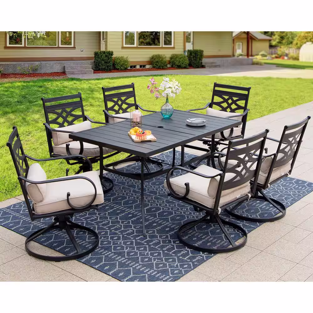 None 7-Piece Metal Outdoor Dining Set with Beige Cushions and Steel Rectangle Dining Table