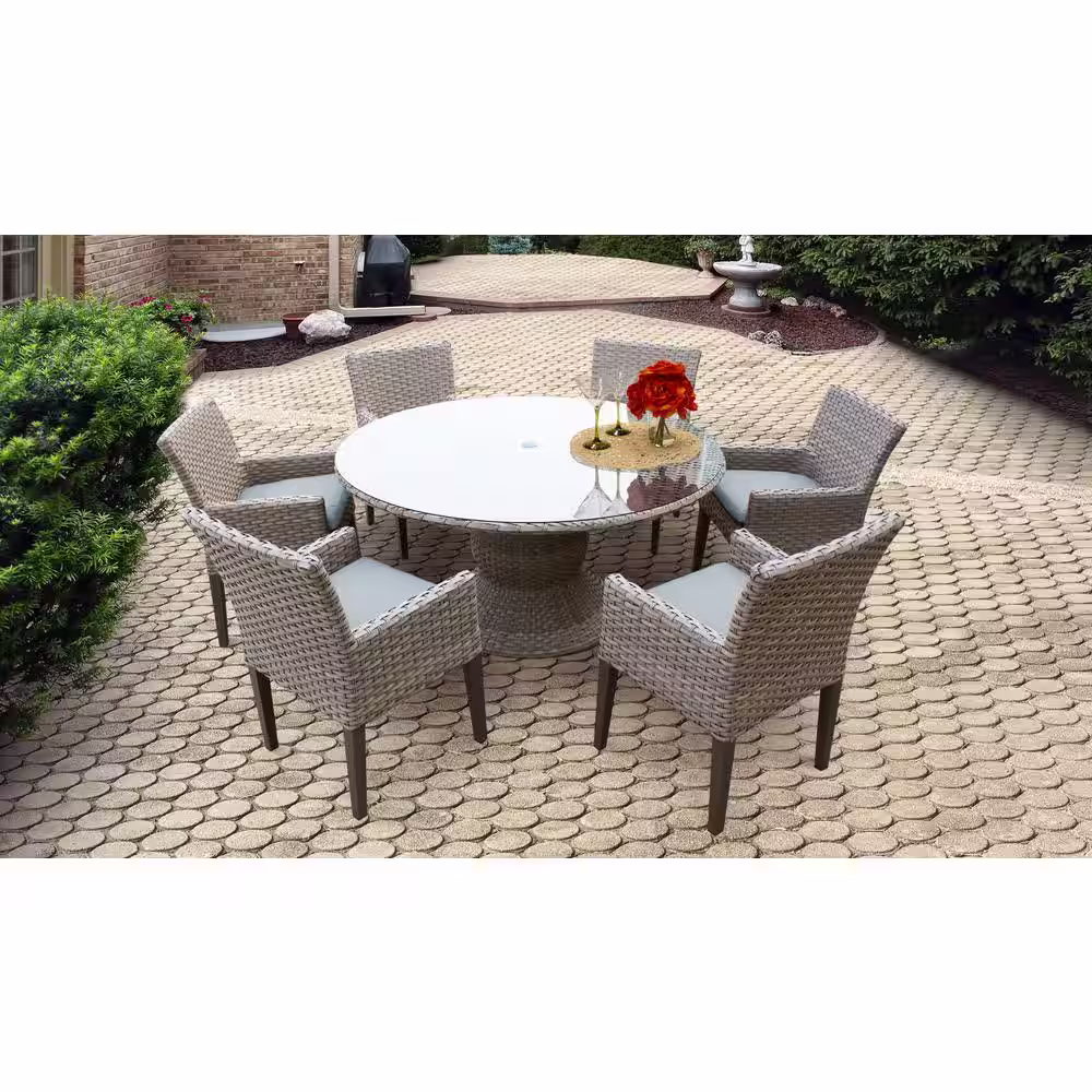 TK CLASSICS Oasis 7-Piece Outdoor Wicker Patio Dining Set with Spa Blue Cushions