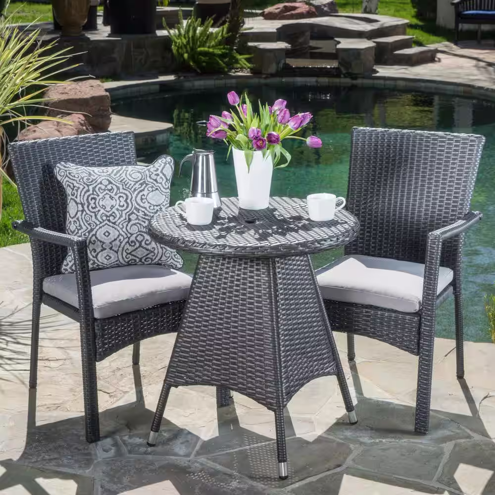 Noble House Gray 3-Piece Faux Rattan Round Outdoor Dining Set with Gray Cushion