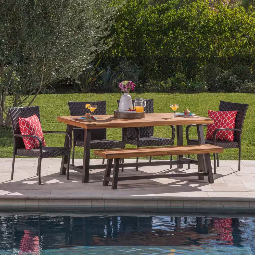 Noble House Elisa 6-Piece Wood and Faux Rattan Outdoor Dining Set with Stacking Chairs and Bench